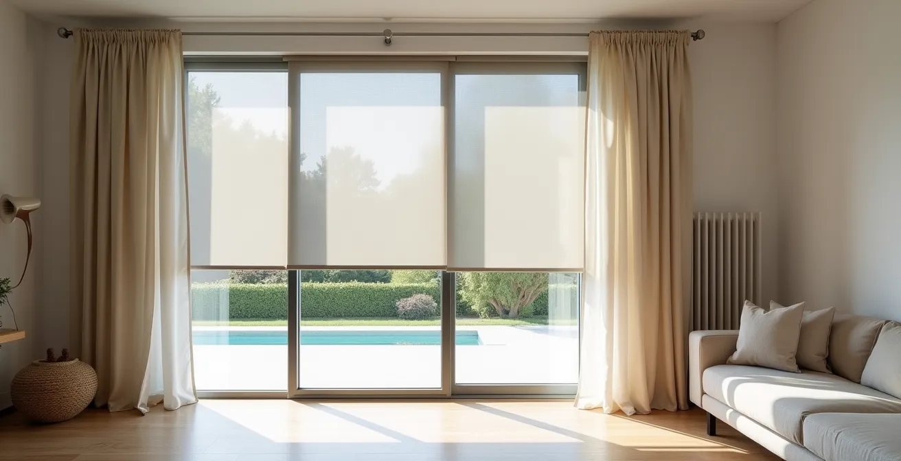 Quando un vetro selettivo viene abbinato a una tenda tecnica interna, l’efficacia del sistema aumenta esponenzialmente. La tenda funge da seconda barriera, assorbendo e riflettendo parte del calore che è comunque riuscito a superare il vetro. L’efficacia varia molto a seconda del posizionamento della schermatura: studi sull’efficienza delle schermature solari dimostrano come una tenda esterna può ridurre il calore fino al 90%, mentre una interna fino al 50% a parità di tessuto. Pur essendo meno performante di una soluzione esterna, la tenda interna rimane uno strumento cruciale e più versatile.